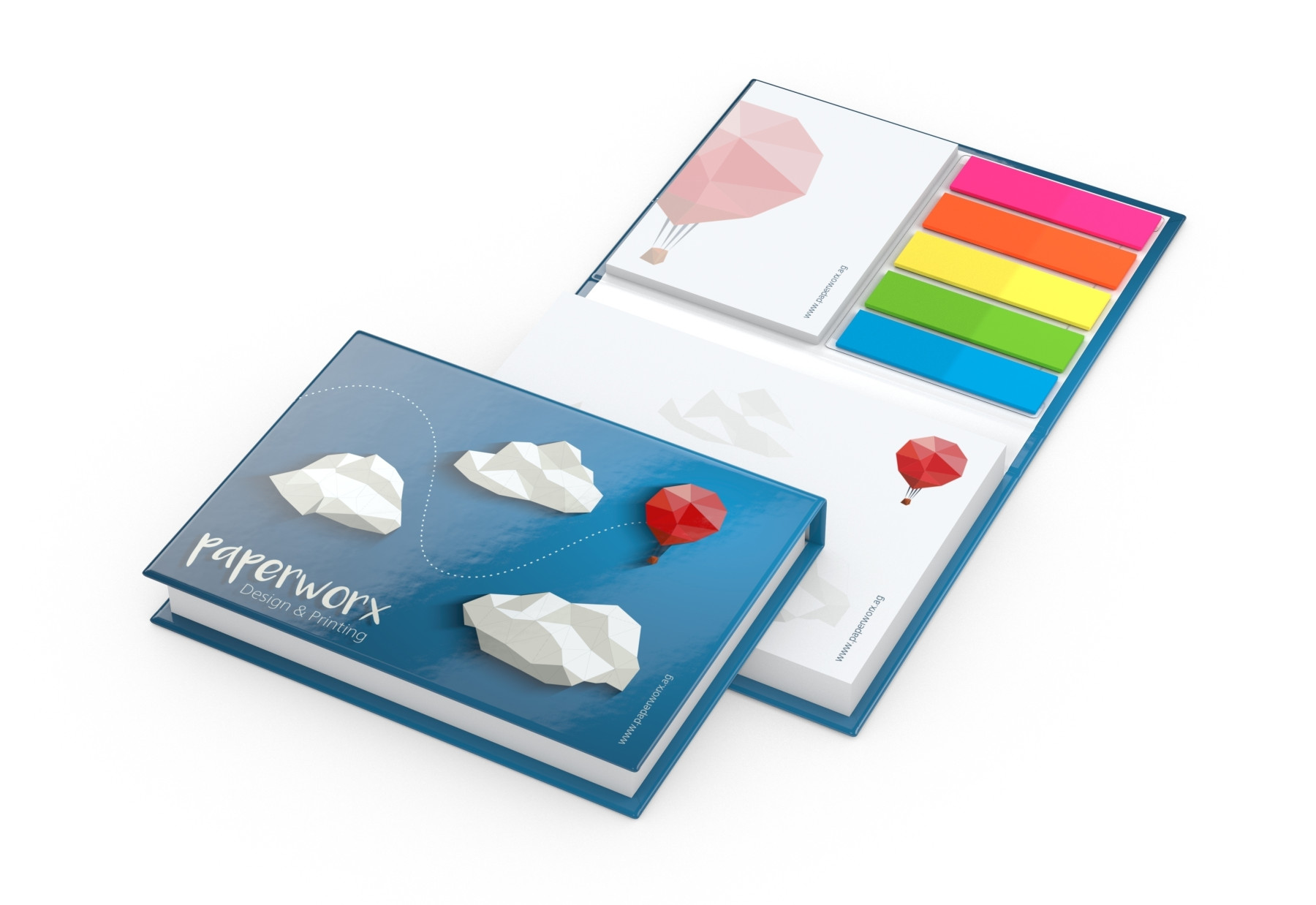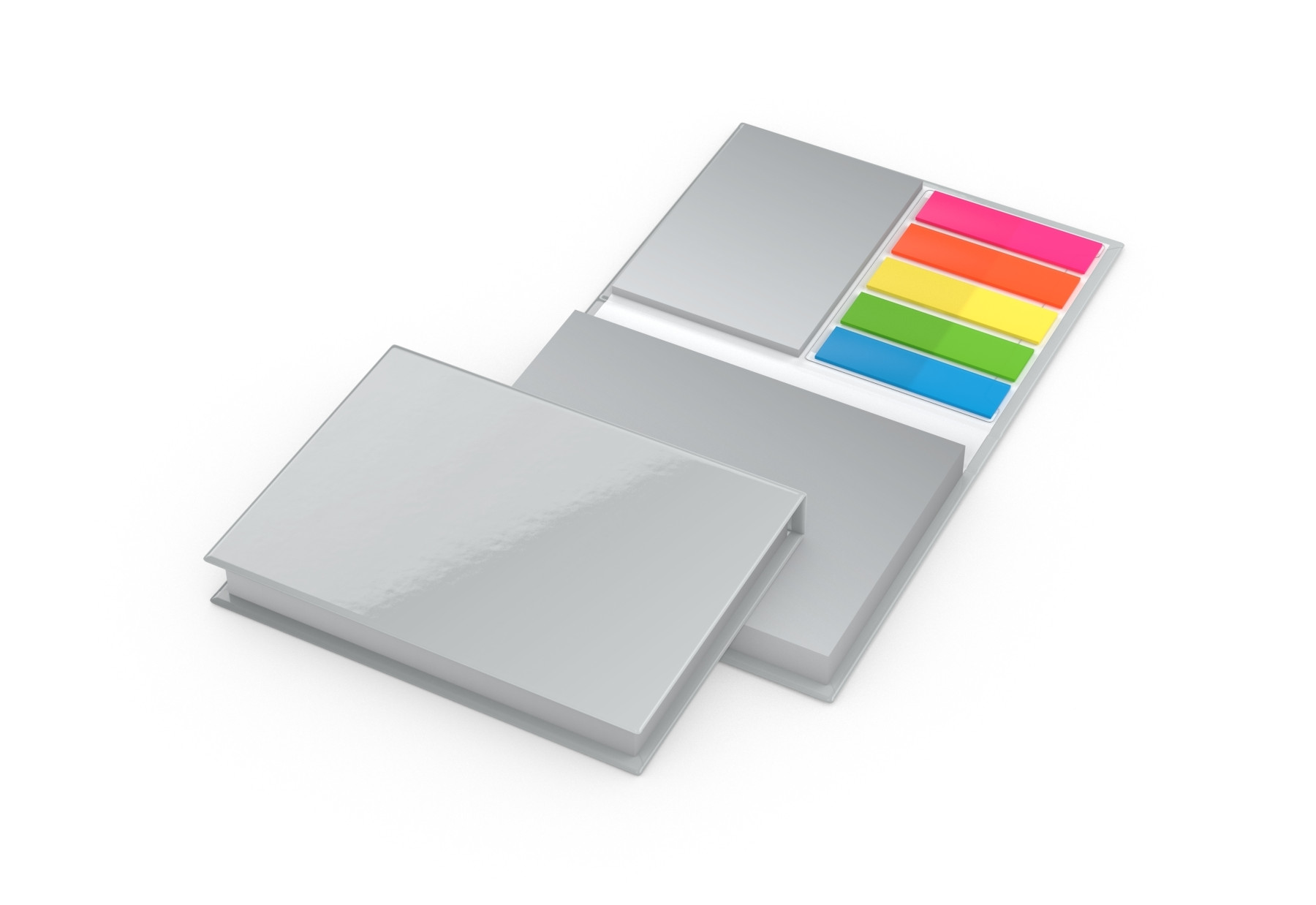 Format: 105 x 78 mm geschlossen; 105 x 170 offen. Ausstattung: Haftnotiz 100 x 72 mm, 100 Blatt Haftpapier weiß; Haftnotiz 50 x 72 mm, 25 Blatt Haftpapier weiß; Filmmarker-Set - 5 x 20 Filmmarker 12 x 44 mm aus transparenter, farbiger Folie (Alternativ: Papiermarker-Set - 5 x 20 mm Papiermarker 12 x 42 mm aus durchgefärbten Papier - ohne Mehrpreis möglich). Umschlag: Bookcover gloss-individuell. Druck: 4C-Quality auf Haftnotizen und Umschlag inklusive. Werbefläche: Umschlag und Haftnotiz. Hinweis: Qualität „Made in Germany“ - Bestellmengen müssen den Angebotsstaffeln entsprechen, Zwischenmengen sind nicht möglich