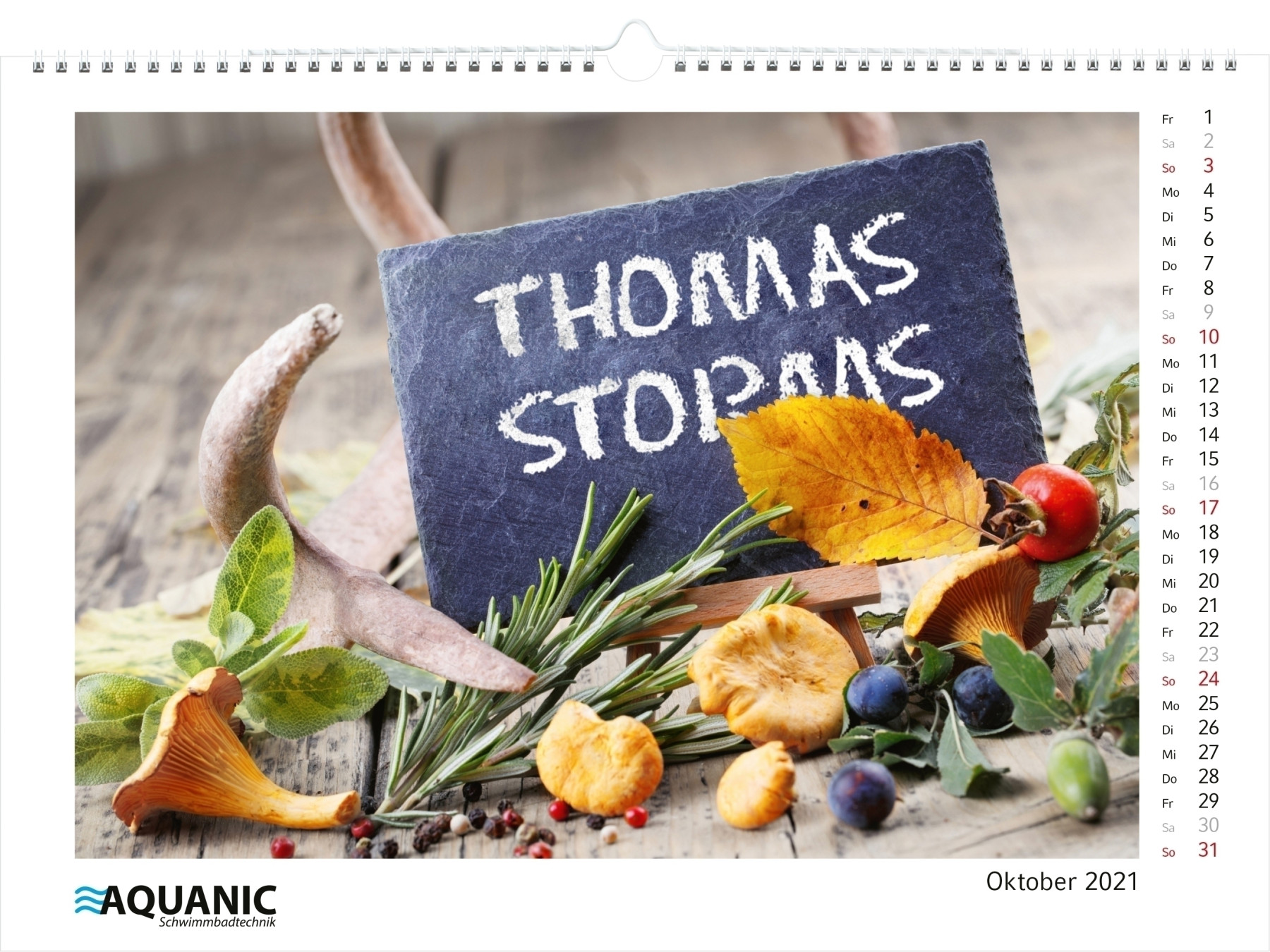 Kalendarium: Deutsch 1sprachig. Umfang: Transparentes Foliendeckblatt, Titelblatt, 12 Monatsblätter, weiße Aufsteller-Rückwand. Verarbeitung: Wire-O-Bindung weiß. Format: 340 x 240 mm gesamt, 285 x 200 mm MagicPix-Motiv. Material: Weißes, seidenmattes Bilderdruckpapier 170 g/m², Chromosulfatkarton-Rückwand. Optionen: Individueller Startmonat. Werbefläche: 320 xx 25 mm am Fuß - auf jedem Blatt in 4C-Quality Digital. Druck: 4C-Quality Digital einseitig. Hinweis: Qualität „Made in Germany“