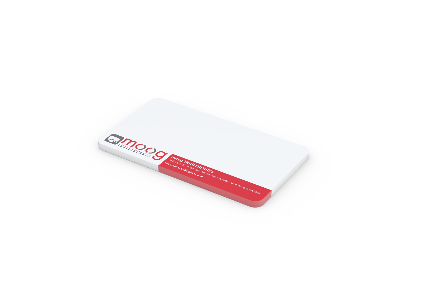 Format: 119 x 66 mm. Verarbeitung: gestanzt, runde Ecken. Umfang: 50 Blatt. Material: Weißes Haftpapier. Druck: 4C-Quality inklusive. Werbefläche: siehe Datenblatt. Hinweis: Qualität „Made in Germany“ - Bestellmengen müssen den Angebotsstaffeln entsprechen, Zwischenmengen sind nicht möglich