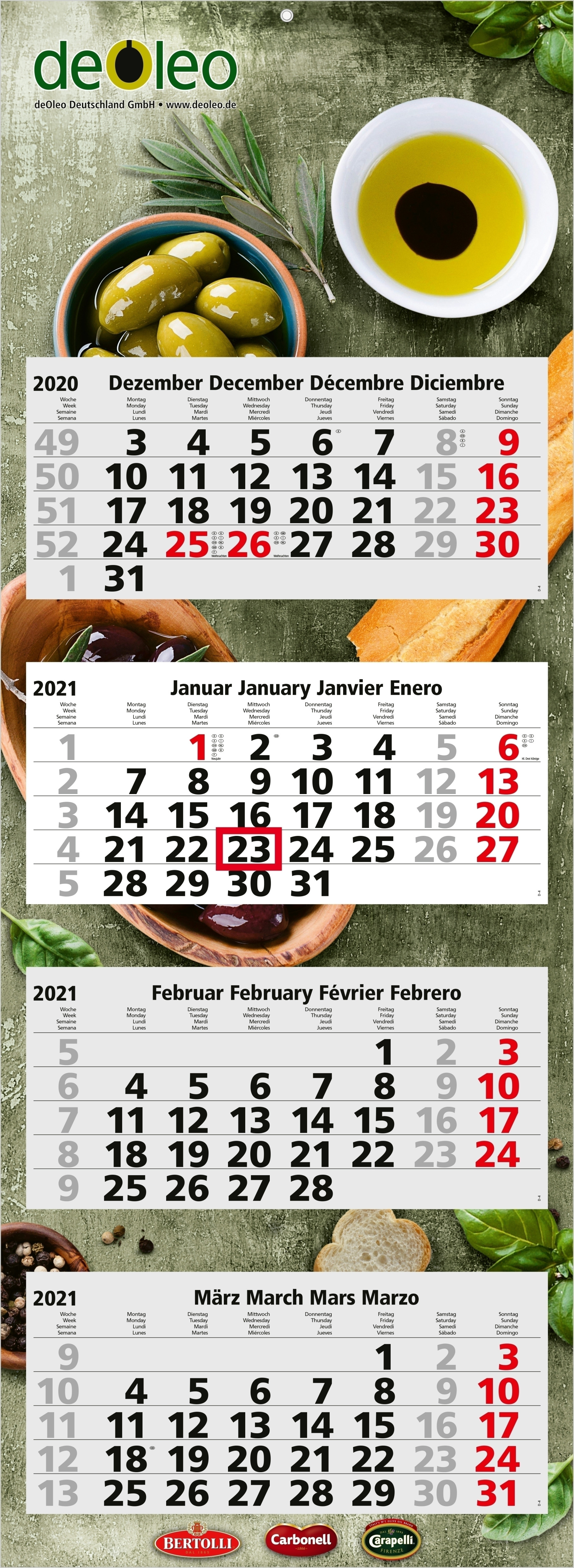 Kalendarium: Deutsch 4sprachig D/GB/F/E - hellgrau. Verarbeitung: Kalenderblocks einzeln perforiert. Rückwand zum dreimaligen Falten gerillt. Blockhalter-Stanzung. Aufhängeöse aus Metalll. Ausstattung: Datumsschieber rot. Format: 330 x 900 mm gesamt. 300 x 140 mm Kalenderblock. Druck: 4C-Quality Digital inklusive. Werbefläche: komplette Rückwand. Hinweis: Qualität „Made in Germany“