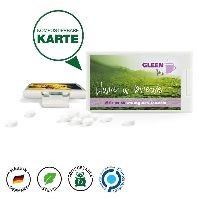 Kompostierbarer Pfefferminzspender auf papierbasiertem Material mit zuckerfreien Minties im Kartenformat, klimaneutral, individuell bedruckt. Farbe: cremeweiß. Inhalt: Zuckerfreie Minties (Pfefferminz mit Stevia), ca. 49 Stück. Haltbarkeit: 18 Monate. Preise: Euro / Stück inkl. 1-4-c Druck auf Vorderseite zzgl. Drucknebenkosten. Kühl und trocken lagern.