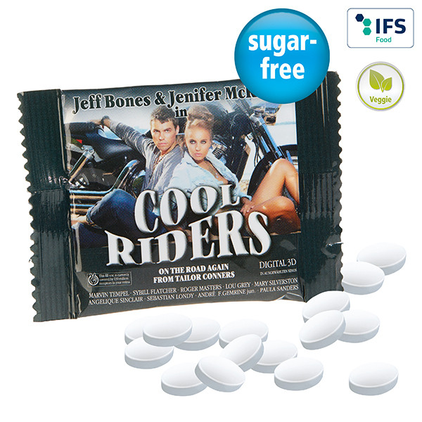 Samtig abgerundete und zuckerfreie Pastillen (ca. 1,6 kcal pro Pastille), oval 13 x 10 mm, in glänzend- oder matt-kaschiertem transparentem alternativ weißem Werbetütchen verpackt. Erfrischend bei jedem Atemzug.