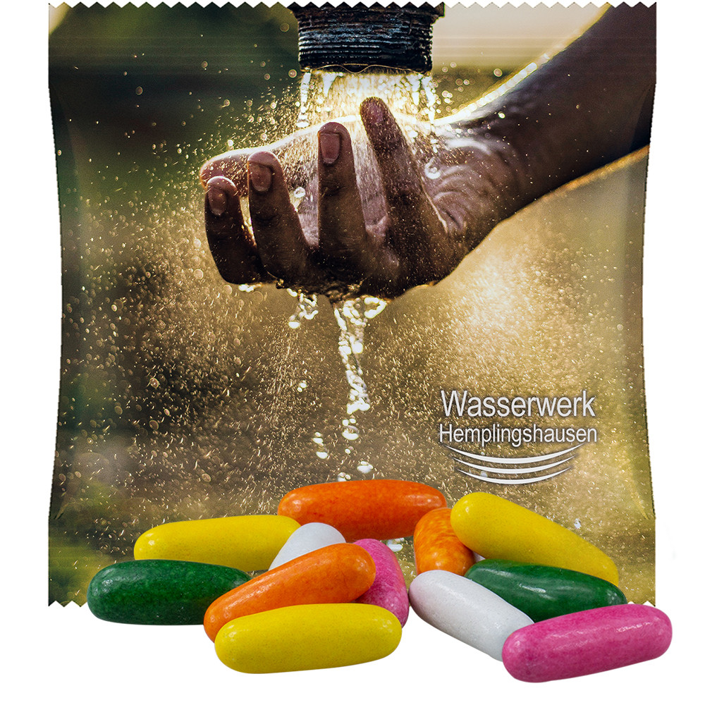 Mini-Tüte aus weißer Folie oder transparenter Folie ohne Weißhinterlegung. Werbeanbringung als Direktdruck in 4c individuell bedruckbar. Zutaten Dragierte Lakritzstäbchen: Zucker, Melasse, Weizenmehl, Glukosestärkesirup, Farbstoffe (E171, E100, E141, E120), Emulgator; E471, Lakritzextrakt, Armoma, Überzugsmittel (E903, E901, E904), Vedickungsmittel: E414, Säureregulator, Zitronensäure, Salz, Konservierungsmittel: Kaliumsorbat, Spuren von Haselnüssen und Mandeln. Werbeflächengröße: 160 x 70 mm