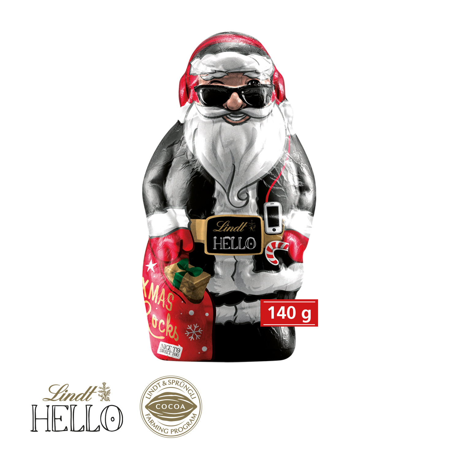 Coole Vibes! Der HELLO XMAS Santa sorgt für einen coolen Vibe in der Vorweihnachtszeit, ganz nach dem Motto: Je kälter die Temperaturen desto cooler die Schokolade. Wenn es in der Weihnachtszeit eine besonders „sweete“ Überraschung sein soll, dann darf der exklusive Lindt HELLO Santa nicht fehlen. Produktdetails: Weihnachtsmann von Lindt HELLO, in hochwertiger Werbekartonage, rundum bedruckbar. Nachhaltigkeit: Klimaneutrales Produkt mit finanziellem Klimabeitrag, auf FSC®-zertifiziertem Karton aus nachhaltiger Forstwirtschaft und anderen kontrollierten Quellen. Das Lindt & Sprüngli Farming-Programm steht für nachhaltige Kakaobohnen-Beschaffung (www.farming-program.com) Haltbarkeit bis 31.03.2025