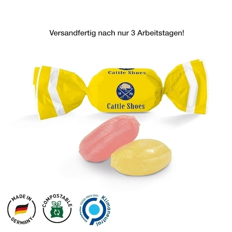 Bonbon im Wickler aus weißer kompostierbarer Folie, klimaneutral, individuell bedruckt Geschmacksrichtung: Fruchtmix Haltbarkeit: 36 Monate. Preise: Euro / kg inkl. 1-4-c Druck zzgl. Drucknebenkosten. Kühl und trocken lagern. Achtung: Bei einer Bestellung von Mustern werden nur ein Paar Bonbons geliefert!