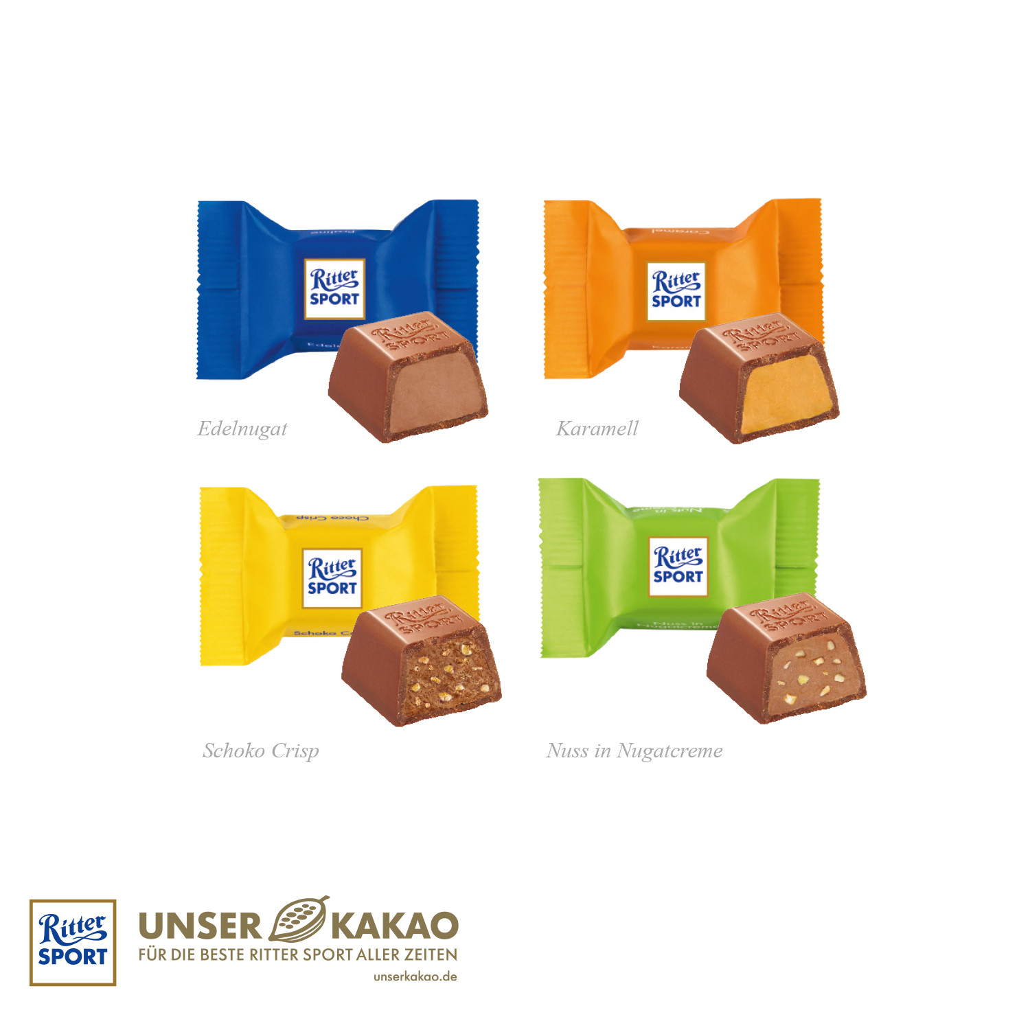 | Inhalt | 4 Schokowürfel von Ritter SPORT (ca. 32 g), Geschmacksrichtungen: Edelnugat, Karamell, Schoko Crisp und Nuss in Nugatcreme, bunt gemischt. Es ist fülltechnisch bedingt möglich, dass nicht immer alle Sorten enthalten sind |