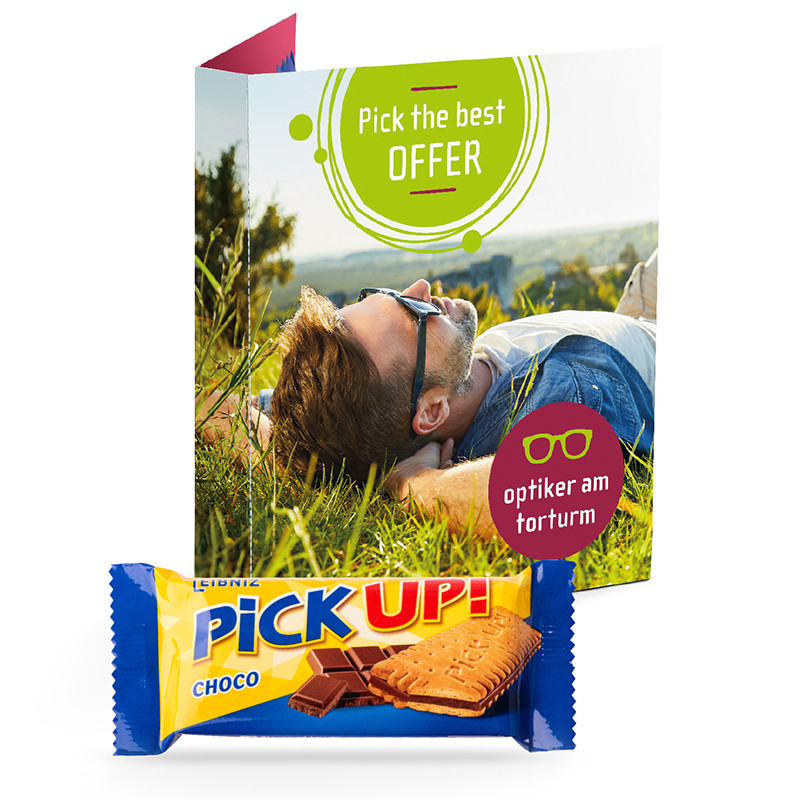 LEIBNIZ Pick Up Mini Choco in aufklappbarer Werbekarte aus weißem, FSC-zertifiziertem Karton mit praktischer Abreißperforation, klimaneutral, individuell bedruckt. Inhalt: Pick Up Mini Choco der Marke LEIBNIZ mit Milchschokoladen Tafel im Keks Sandwich, 10 g. Haltbarkeit: 5 Monate. Preise: Euro / Stück inkl. 4-c Euroskala Druck zzgl. Drucknebenkosten. Kühl und trocken lagern.