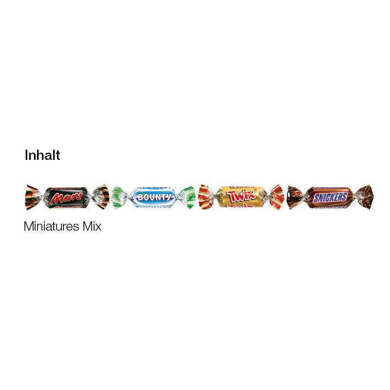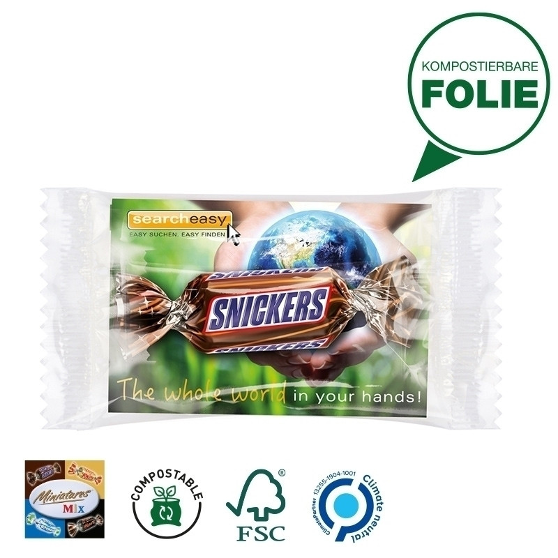 Miniatures Mix Schokoriegel in transparenter, kompostierbarer Außenfolie mit eingeschobener Werbekarte aus weißem, FSC-zertifiziertem Karton, klimaneutral, individuell bedruckt. Inhalt: Mini Schokoriegel Mars, Snickers, Bounty und Twix der Marke Mars, bunt gemischt, 10 g. Haltbarkeit: 3 Monate. Preise: Euro / Stück inkl. 4-c Digitaldruck zzgl. Drucknebenkosten. Kühl und trocken lagern.