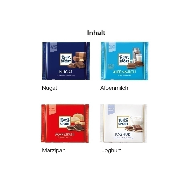 Ritter SPORT Schokolade 100 g mit FSC-zertifizierter Papierbanderole, klimaneutral, individuell bedruckt. Inhalt: Schokoladentafel der Marke Ritter SPORT (nur sortenrein), 100 g. Weitere Sorten ab einer Mindestmenge von 1.000 Stück auf Anfrage. Haltbarkeit: 6 Monate. Preise: Euro / Stück inkl. 4-c Euroskala Druck zzgl. Drucknebenkosten. Kühl und trocken lagern.
