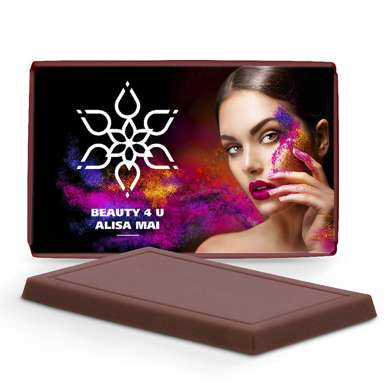 Zuckerreduziertes Schokoladen Täfelchen eingeschlagen in weißes Papier, klimaneutral, individuell bedruckt. Inhalt: Deutsche Markenschokolade, Alpenvollmilchschokolade mit 30 % weniger Zucker, 7,5 g. Haltbarkeit: 6 Monate. Preise: Euro / Stück inkl. 4-c Euroskala Druck zzgl. Drucknebenkosten. Kühl und trocken lagern.