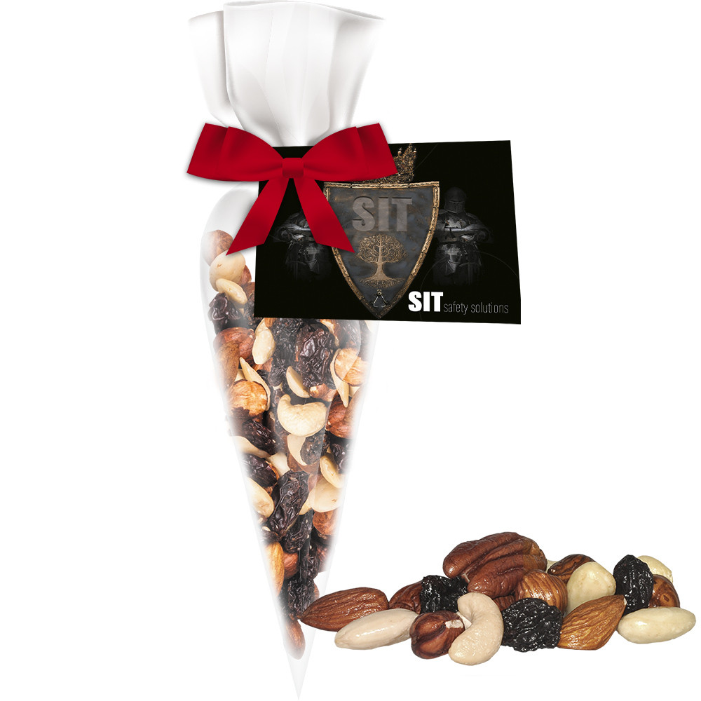 Spitztüte aus transparenter Folie. Werbeanbringung als Werbekarte in 4c individuell bedruckbar. Zutaten Studentenfutter: Nusskernmischung 60% (in veränderlichen Gewichtsanteilen: Haselnusskerne, Mandeln blanchiert, Mandeln, Cashewkerne, Pekannusskerne), Rosinen 40%; Kann Spuren von anderen Schalenfrüchten und Getreide enthalten. Produkt unterliegt naturgegebenen Schwankungen - trotz strenger Qualitätskontrolle können Schalen- bzw. Kernbestandteile nicht ausgeschlossen werden. Werbeflächengröße: 85 x 55 mm