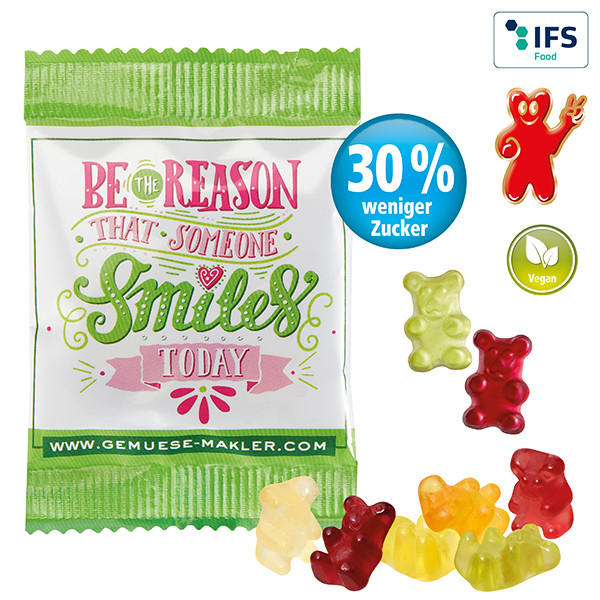 Fruchtgummi ohne Gelatine mit 30 % weniger Zucker, im Vergleich zu herkömmlichem Fruchtgummi, mit Aromen und färbenden Pflanzenauszügen, farblich und geschmacklich bunt gemischt, in glänzend- oder matt-kaschiertem transparentem alternativ weißem Werbetütchen verpackt.