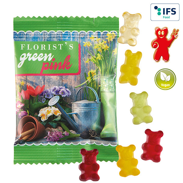 Veganes Fruchtgummi ohne Gelatine, mit Aromen und färbenden Pflanzenauszügen, farblich und geschmacklich bunt gemischt, in glänzend- oder matt-kaschiertem transparentem alternativ weißem Werbetütchen verpackt.