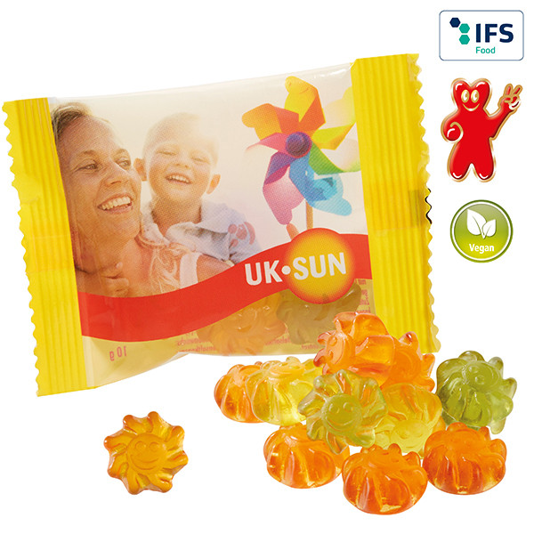 Veganes Fruchtgummi mit Aloe Vera und Ballaststoffen aus der Chicoréewurzel, mit natürlichen Aromen und färbenden Pflanzenauszügen, ohne Gelatine, farblich und geschmacklich bunt gemischt, in glänzend- oder matt-kaschiertem transparentem alternativ weißem Werbetütchen verpackt.