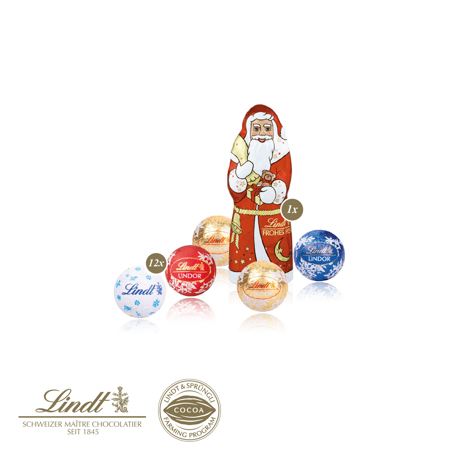 Inhalt 12 Stück Lindt „Minis“ (ca. 55 g) bunt gemischt und einem zartschmelzenden Lindt Weihnachtsmann (10 g)