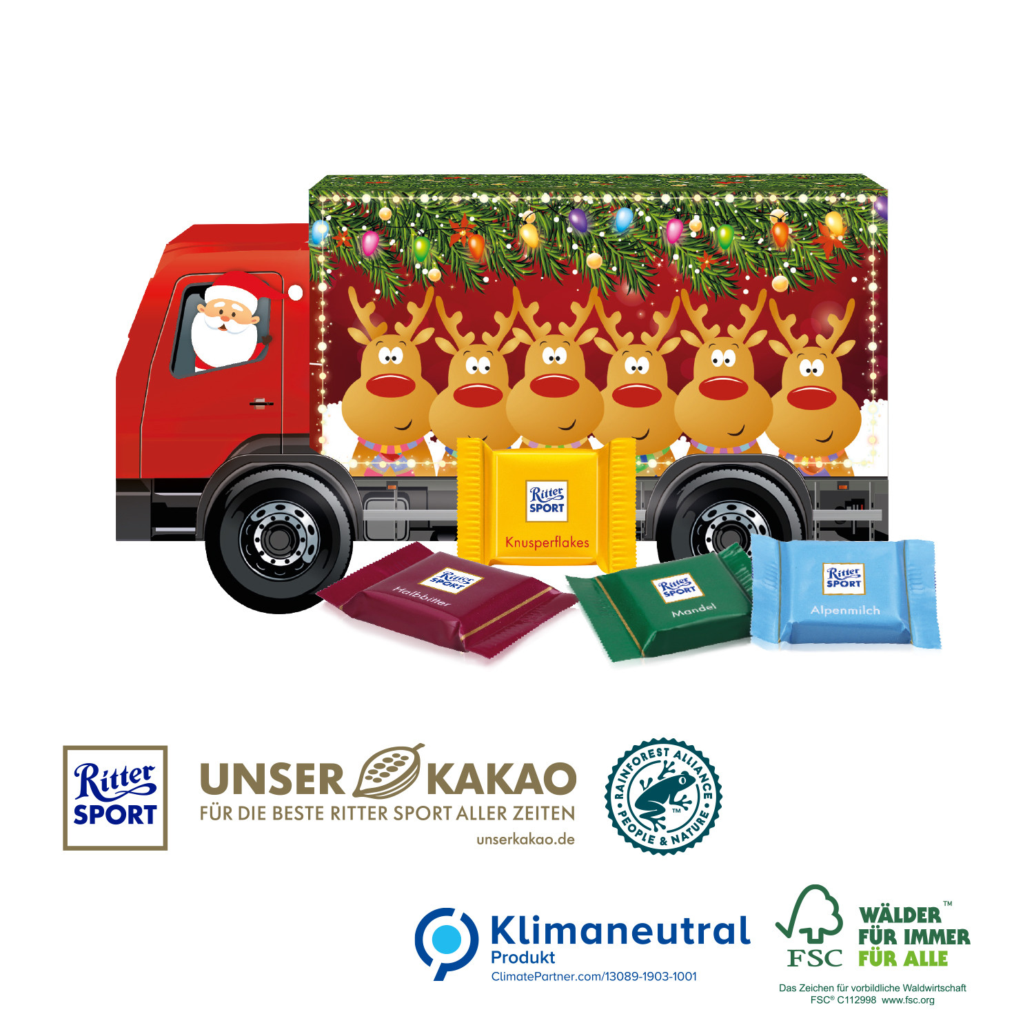 Sympathische Kundenbindung zum attraktiven Preis! Ihr individuell bedruckbares Präsent als „Weihnachtshaus“, „Transporter“, „LKW“, „Camper“ oder „Container“, mit vielen Gestaltungsmöglichkeiten. Gefüllt mit feiner Markenschokolade. Nachhaltigkeit: Klimaneutrales Produkt, gefertigt auf FSC®-zertifiziertem Karton aus nachhaltiger Forstwirtschaft. Ritter SPORT bezieht Rainforest Alliance-zertifizierten, nachhaltigen Kakao (www.unserkakao.de).