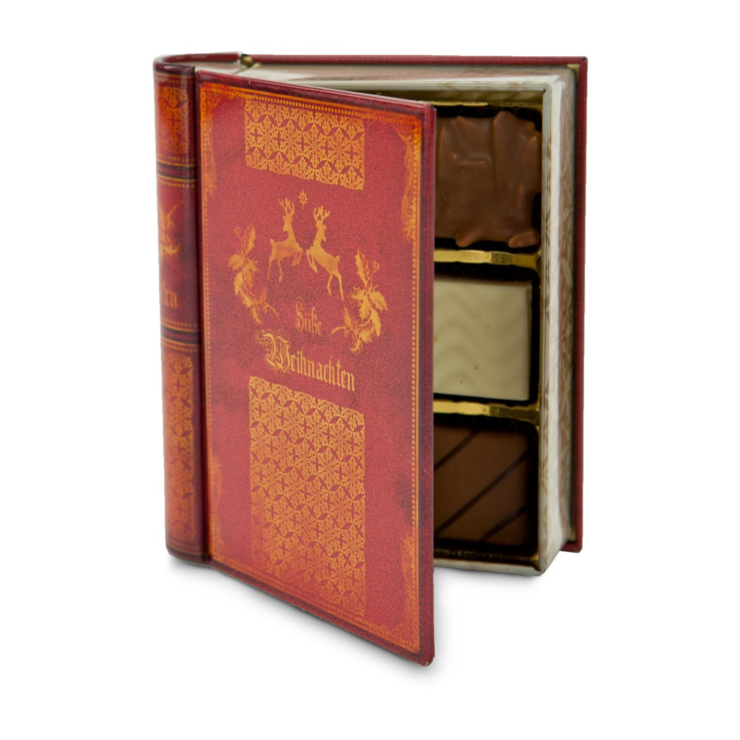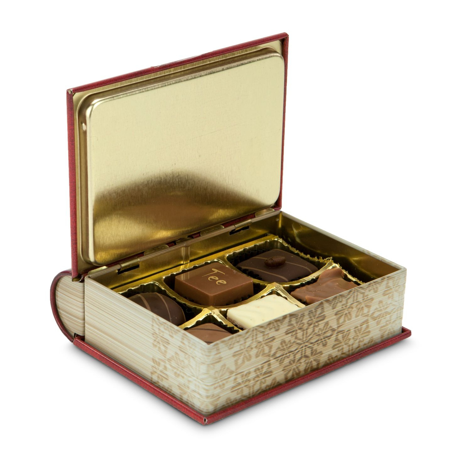 Hier gibt es nichts zu lesen, auch wenn es so aussieht: Nach dem Öffnen des Metallbuches entdeckt man 6 leckere Pralinen (75 g). Eine süße Überraschung!