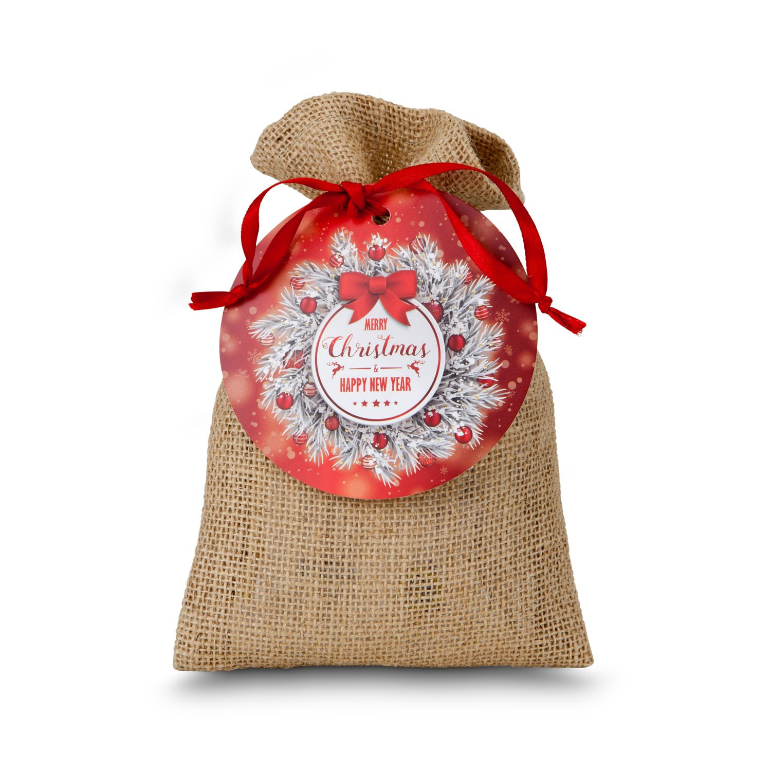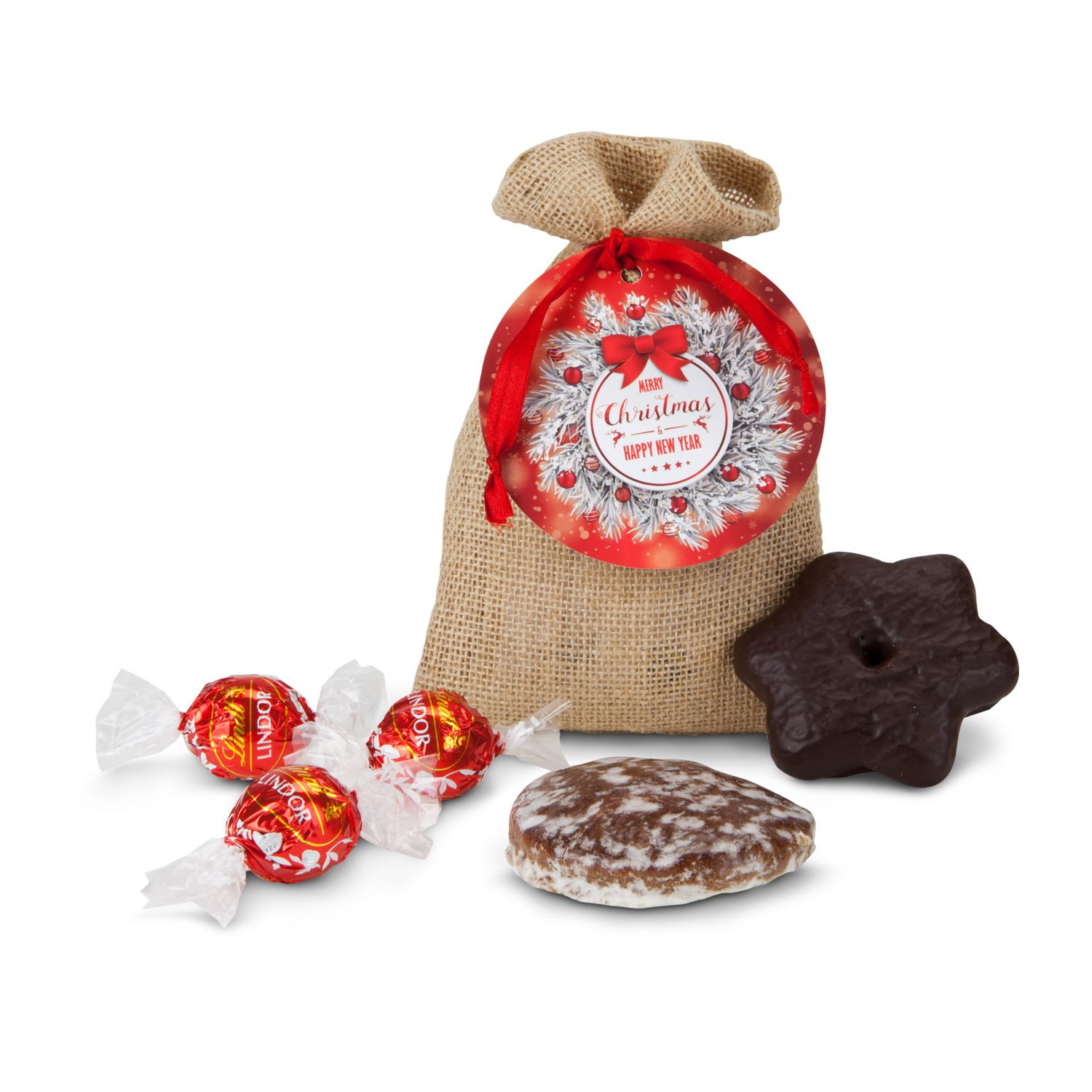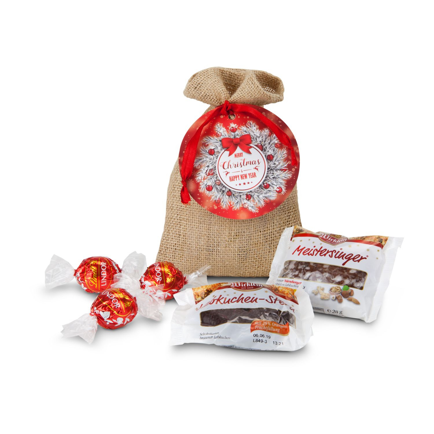 Was verbirgt sich wohl in diesem kleinen Säckchen mit dem stimmungsvollen Weihnachtsanhänger? Etwas für süße Naschkatzen. Überraschen Sie Ihre Kollegen und Kunden mit einem leckeren Meistersinger Oblaten-Lebkuchen (28 g mit 20% Nüssen und Kernen, glasiert) und einem feinen Lebkuchen-Stern (25 g mit 25% Orangen-Fruchtfüllung, schokoliert) sowie 3 weihnachtlich-roten Lindt Lindorkugeln (je 12,5 g)! Der hübsche Anhänger wünscht auf der einen Seite „Frohe Weihnachten“ und auf der anderen „Merry Christmas“.