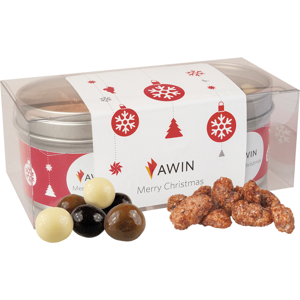 Knusper Weihnachtsset mit feuergebrannten Mandeln und Knusperkugeln im MIx, ca. 105g, Metalldose mit Sichtfenster im 2er Set