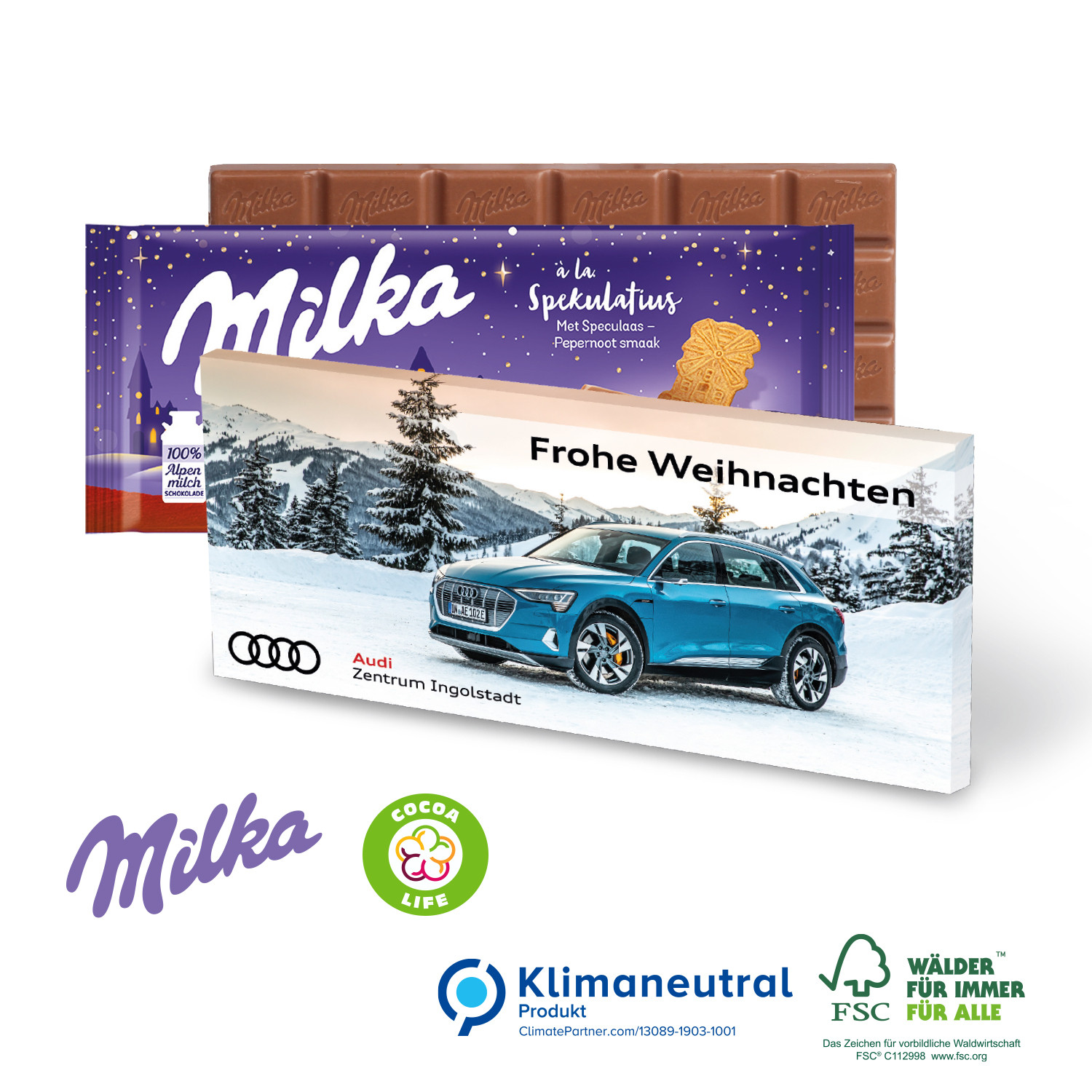 Milka: Im Herzen zart! Leckere zartschmelzende Weihnachtsschokolade aus 100 % Alpenmilch in einer individuell bedruckbaren Werbeverpackung. Nachhaltigkeit: Klimaneutrales Produkt. FSC®-zertifizierter Karton aus nachhaltiger Forstwirtschaft. Cocoa Life ist ein ganzheitliches Programm für nachhaltigen Kakao, mit dem letztendlichen Ziel, den gesamten Kakaobedarf aus nachhaltigem Anbau zu beziehen (www.cocoalife.org).