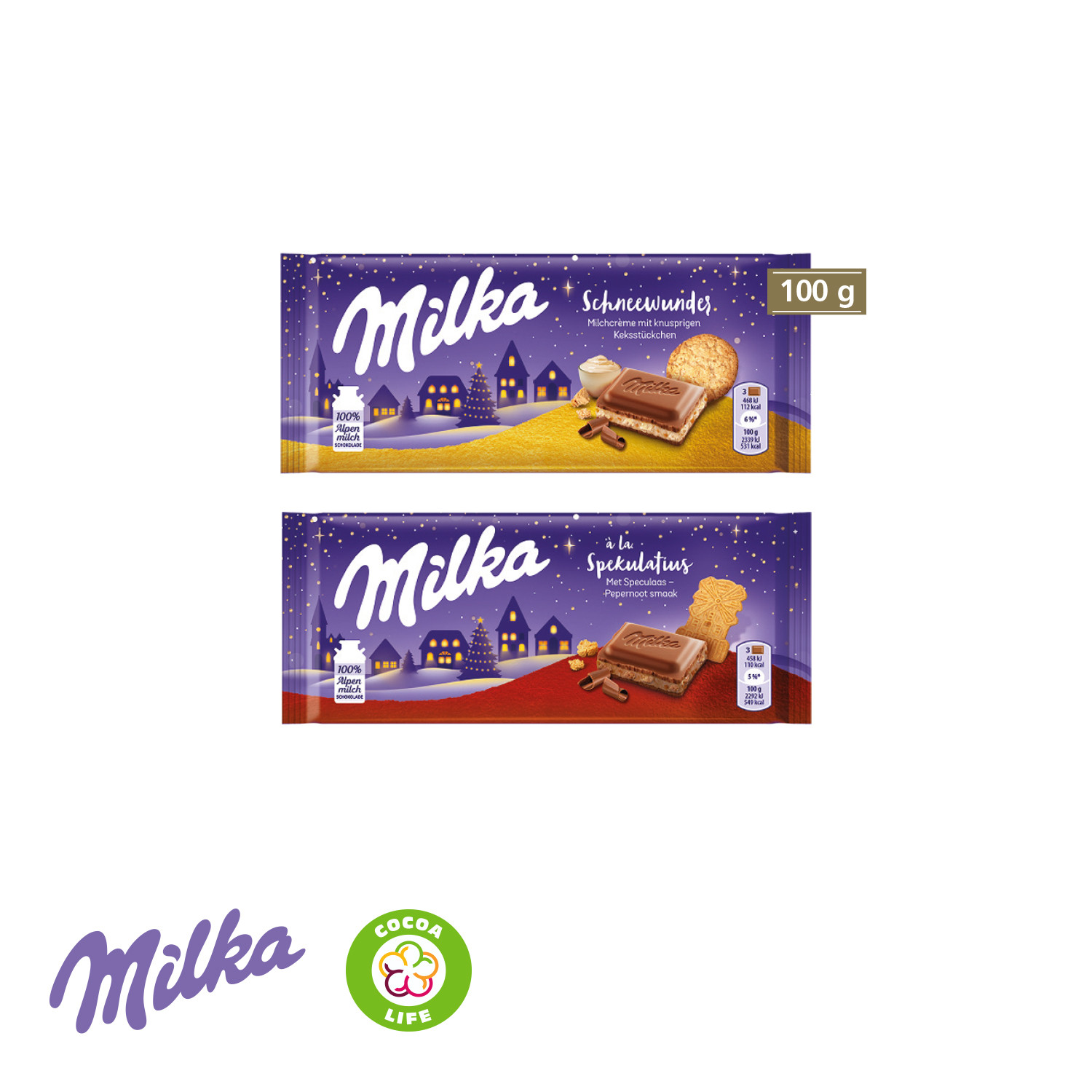 Inhalt 1 Schokoladentafel (100 g) von Milka. Geschmacksrichtungen: Schneewunder oder Spekulatius