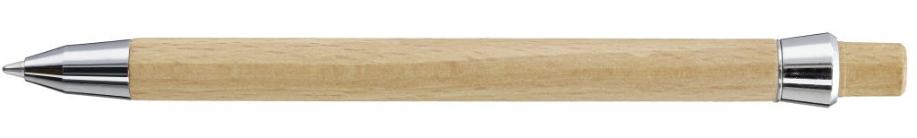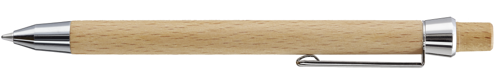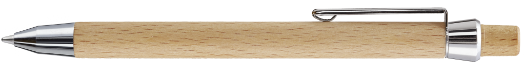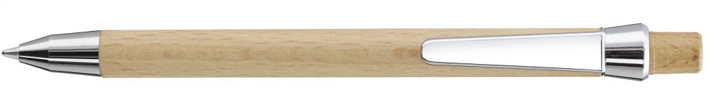 Holz-Druckkugelschreiber mit Holzdrücker, Metallclip und Metallspitze glanzverchromt. Schaft und Drücker aus schutzlackiertem PEFC-zertifiziertem Buchenholz. Hier geht´s zum [[https://www.youtube.com/watch?v=9Yy6g1ujeBE|Video]].