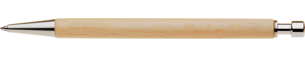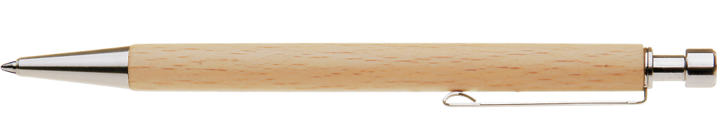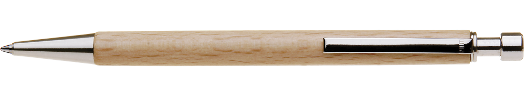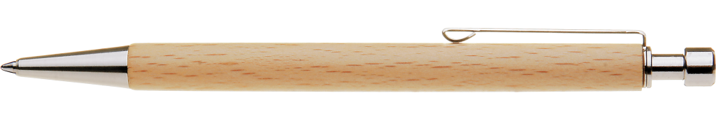 Holz-Druckkugelschreiber mit Metalldrücker, Metallclip und Metallspitze silber glänzend. Schaft aus schutzlackiertem PEFC-zertifiziertem Buchenholz. Hier geht´s zum [[https://www.youtube.com/watch?v=9Yy6g1ujeBE|Video]].