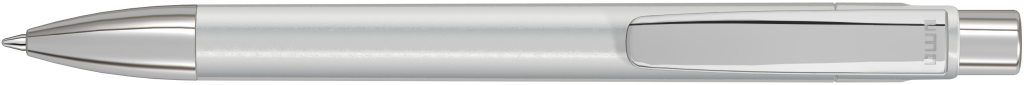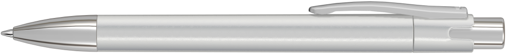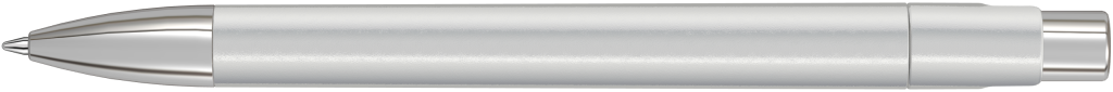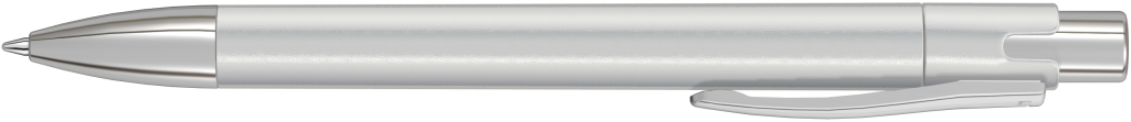 Druckkugelschreiber mit silber glänzendem Gehäuse, schwerer Metallspitze, Metalldrücker und Metallclip glanzverchromt.