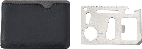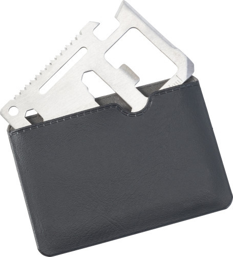 Multifunktionswerkzeug 'Survive' aus Edelstahl mit 11 Funktionen: Messer, Dösenöffner, Flügelmutter, Säge, Schraubendreher, Flaschenöffner, Lineal, verschieden große Schraubenschlüssel in einem PU Beutel.