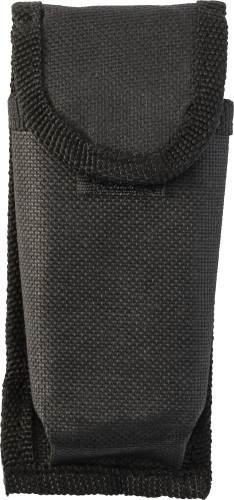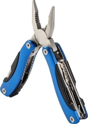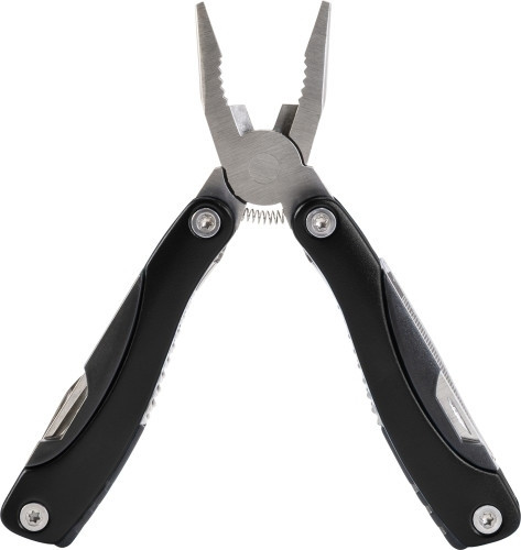 Multifunktionswerkzeug 'Tough' aus Metall und Kunststoff. Funktionen: Zange, Säge, Messer, zwei Schraubendreher (Kreuz und Schlitz), Feile, Flaschen und Dosenöffner, Fischschaber, Nussknacker und Lineal mit Inch-Angabe. In einem kleinen Beutel geliefert.