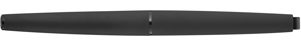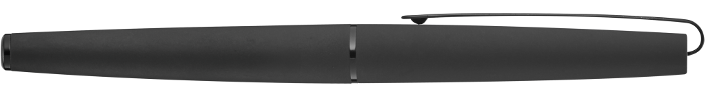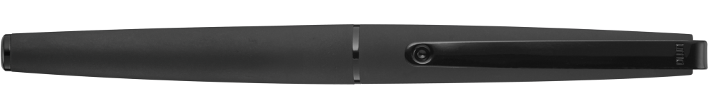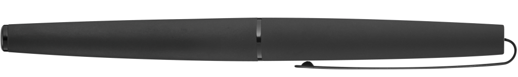 Metall-Rollerball mit matt lackiertem Gehäuse. Langer flexibler Metallclip, Zierring und Stopfen schwarz glänzend. Griffzone gerillt schwarz glänzend.