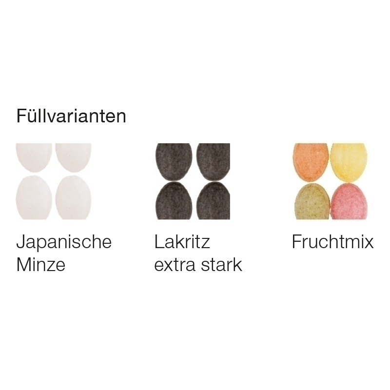 Micro Bonbons in Box mit "Klick-Verschluss" aus weißem Karton in transparenter Zellglasschutzhuelle, individuell bedruckt