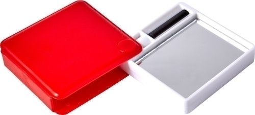 Haftnotiz-Box 'Swing' aus Kunststoff, mit Haftnotizen (Grün, Gelb, Pink) je 25 Blatt, Spiegel und Mini-Kugelschreiber (blaue Mine)
