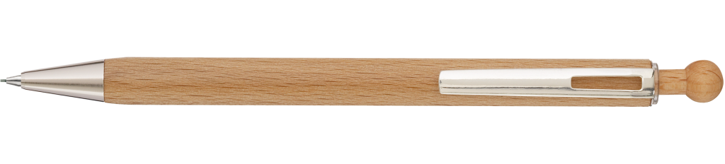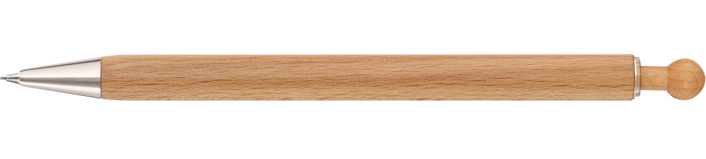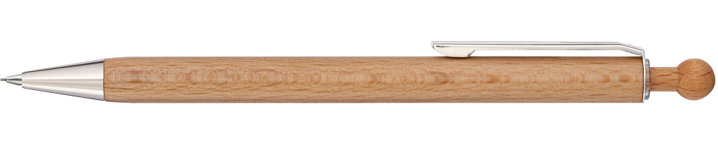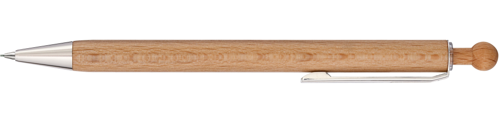 Holz--Druckbleistift (0,7mm) mit Holz-Kugeldrücker, Metallclip und Metallspitze silber glänzend. Schaft und Drücker aus schutzlackiertem PEFC-zertifiziertem Buchenholz. Hier geht´s zum [[https://www.youtube.com/watch?v=9Yy6g1ujeBE|Video]].