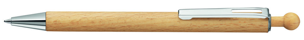 Holz-Druckkugelschreiber mit Holz-Kugeldrücker, Metallclip und Metallspitze silber glänzend. Schaft und Drücker aus schutzlackiertem PEFC-zertifiziertem Buchenholz. Hier geht´s zum [[https://www.youtube.com/watch?v=9Yy6g1ujeBE|Video]].