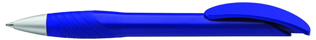 Druckkugelschreiber mit gedeckt glänzendem Gehäuse, Bogenclipdrücker, ergonomische Gummigriffzone und Metallspitze mattverchromt.