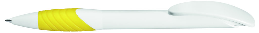 Druckkugelschreiber mit gedeckt mattem Gehäuse, Bogenclipdrücker und Spitze in weiß, ergonomische, farbige Gummigriffzone.