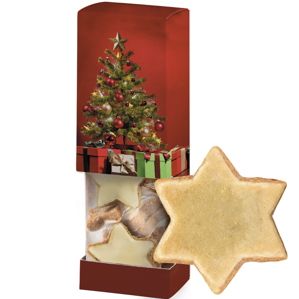 Faltschachtel mit Sichtfenster. Werbeanbringung als Direktdruck in 4c individuell bedruckbar. Zutaten Zimtsterne: Rohrohrfeinzucker(54 %), Haselnusskerne(19 %), Marzipan, Eiweiß, Wasser, Zimt (1%); Werbeflächengröße: 60 x 190 x 40 mm