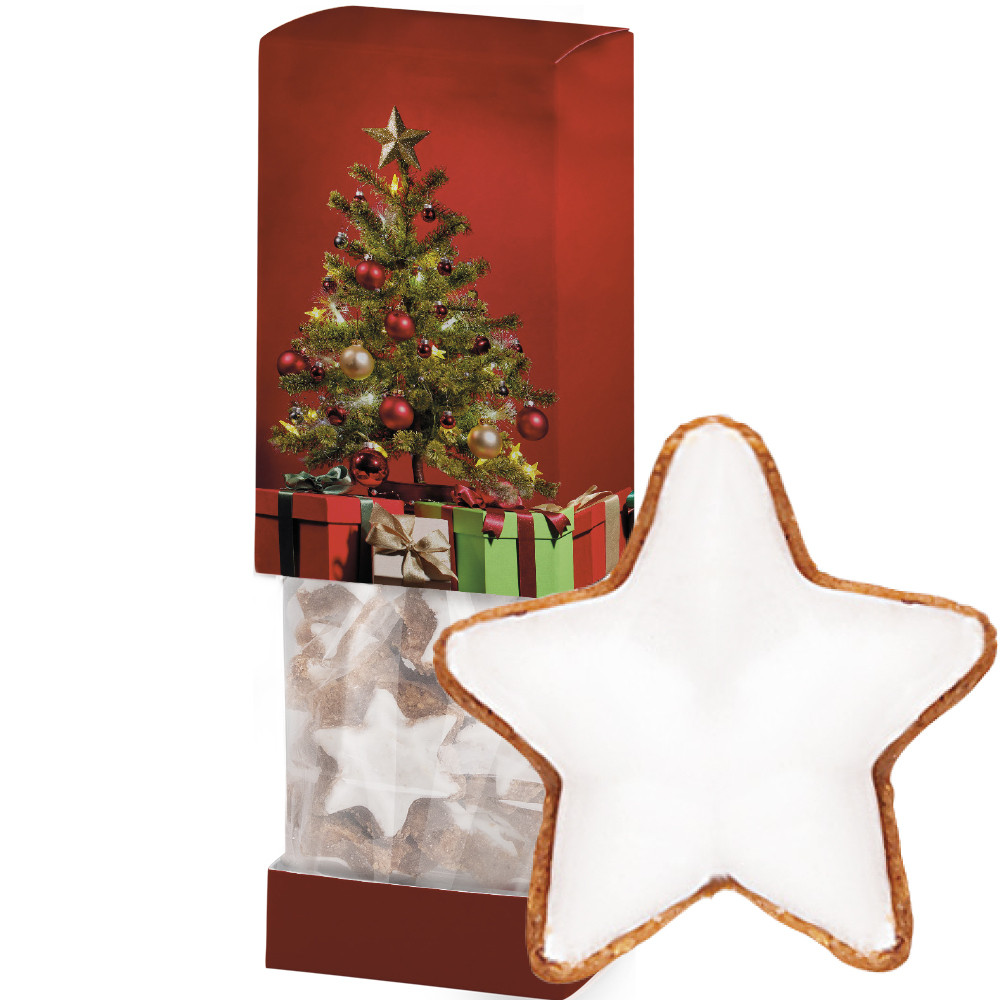 Faltschachtel mit Sichtfenster. Werbeanbringung als Direktdruck in 4c individuell bedruckbar. Zutaten Zimtsterne: Zucker, Mandel-Haselnuss-Mischung (Mandeln, Haselnüsse), Weizenmehl, brauner Zuckersirup, Palmfett, Feuchthaltemittel: Sorbit, Invertase; Invertzuckersirup, Kartoffelstärke, Glukose-Fruktose-Sirup, Hühnereitrockeneiweiß, Süßmolkenpulver, Karamellzuckersirup, Rapsöl, Zimt, Orangenschalen, Apfelmark, Roggenmehl, Weizenstärke, Gewürze, Glukosesirup, Gelatine, Aprikosenkerne, Emulgatoren: Lecithine, Mono- und Diglyceride von Speisefettsäuren; Geliermittel: Pektin; Säuerungsmittel: Citronensäure; Backtriebmittel: Ammoniumcarbonate, Kaliumcarbonate, Natriumcarbonate, Diphosphate; natürliches Aroma, Salz. Kann andere Schalenfrüchte, Erdnüsse und Soja enthalten. Werbeflächengröße: 60 x 190 x 40 mm